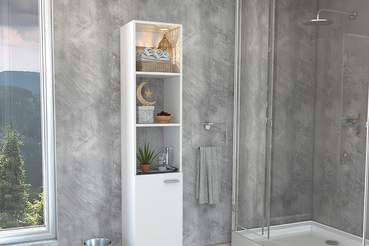 تعتبر وحدة تخزين حمام و مطبخ 3 أرفف مفتوحة و ضلفة مع رفين خشب أبيض من متجر جادوودز خيارا مثاليا لمن يسعون إلى الجمع بين الأناقة والعملية في منازلهم.