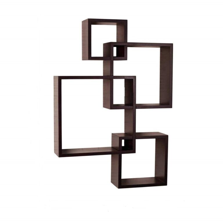 رف حائط خشب MDF بلون بني جذاب، بتصميم متداخل لأربع مربعات بأحجام مختلفة.