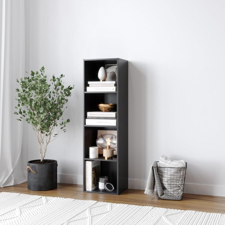 - اختر اللون الذي يتناسب مع بقية أثاث الغرفة واللون الأسود، كما في خزانة كتب منخفضة 4 أرفف عمودية، يمنح شعورًا بالعمق والأناقة.